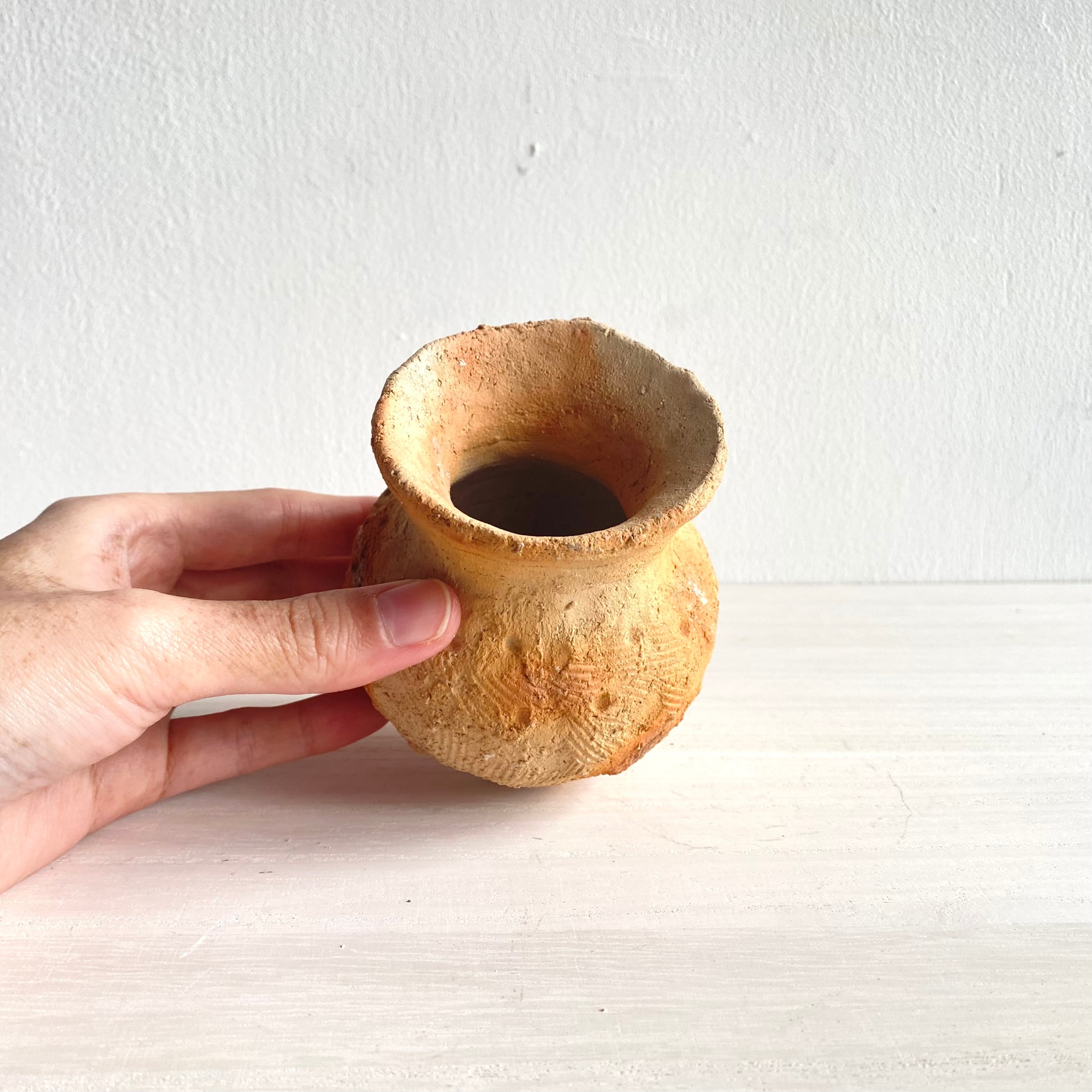 野焼きで焼いた土の優しい色味がでた土器です。
